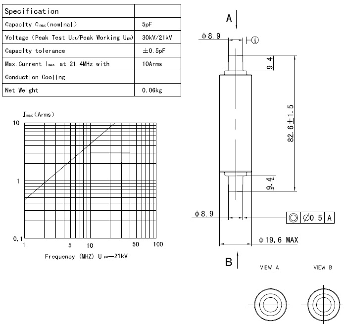 CKT5/21/12型固定陶瓷高压真空电容器采用陶瓷外壳、真空介质、具有耐压高、体积小、Q值高、性能稳定可靠价格低廉等特点,广泛用于感应加热、介质加热、通讯、广播等设备。