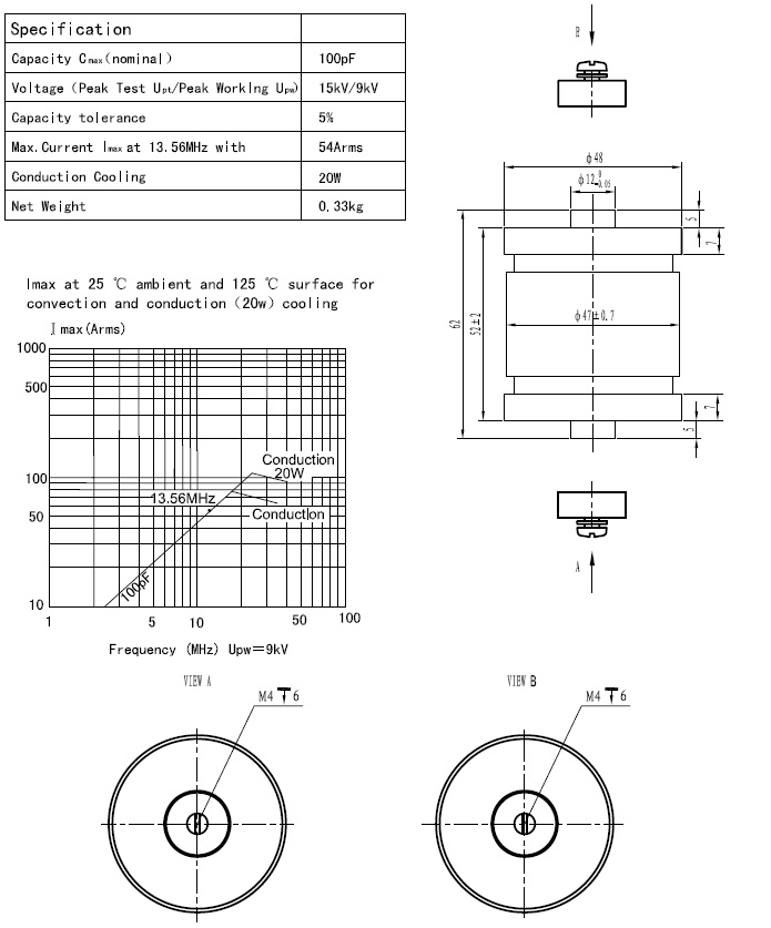 CKT100/10/54固定陶瓷高压真空电容器采用陶瓷外壳、真空介质、具有耐压高、体积小、Q值高、性能稳定可靠价格低廉等特点,广泛用于感应加热、介质加热、通讯、广播等设备。