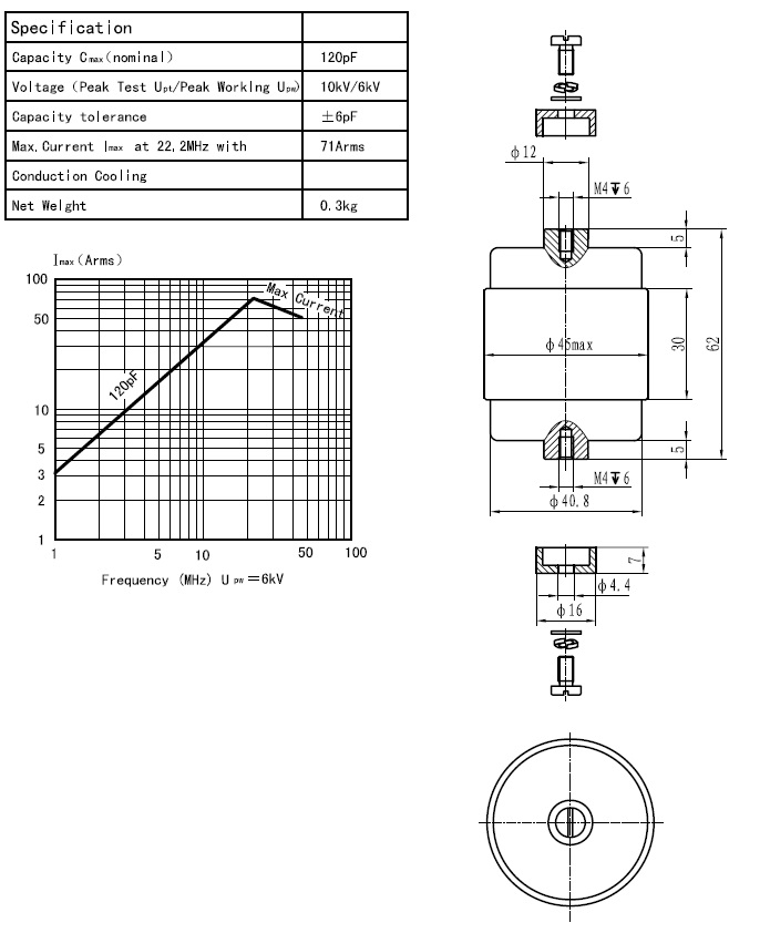 CKT120/7.5/71固定陶瓷高压真空电容器采用陶瓷外壳、真空介质、具有耐压高、体积小、Q值高、性能稳定可靠价格低廉等特点,广泛用于感应加热、介质加热、通讯、广播等设备。