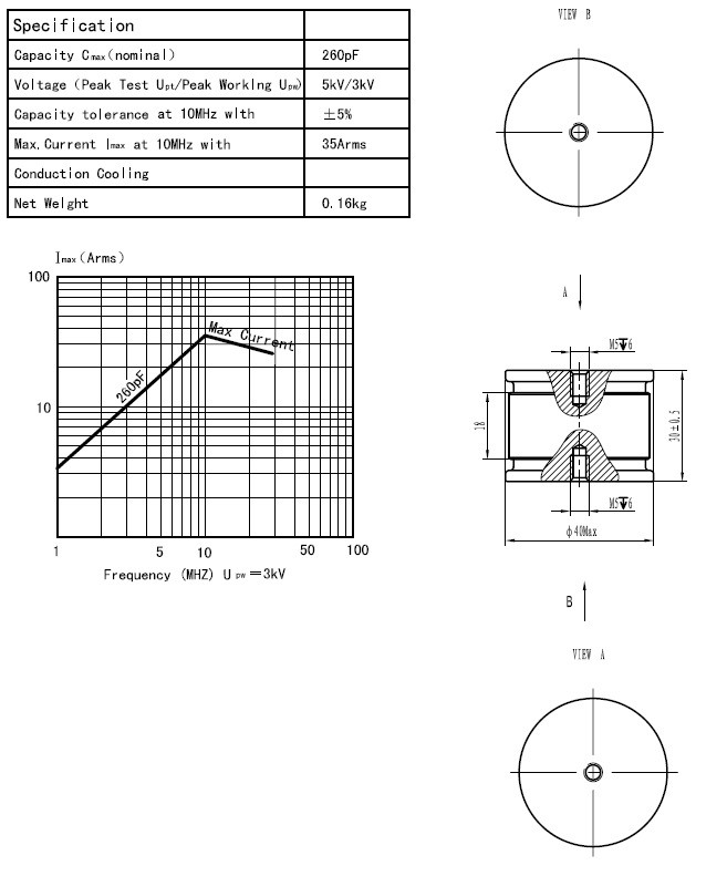CKT260/3.5/35型固定陶瓷高压真空电容器采用陶瓷外壳、真空介质、具有耐压高、体积小、Q值高、性能稳定可靠广泛用于感应加热、介质加热、通讯、广播等设备。