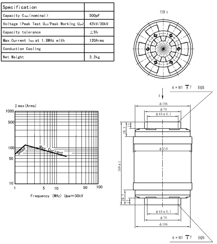 CKT500/30/120(I)固定陶瓷高压真空电容器采用陶瓷外壳、真空介质、具有耐压高、体积小、Q值高、性能稳定可靠价格低廉等特点,广泛用于感应加热、介质加热、通讯、广播等设备。