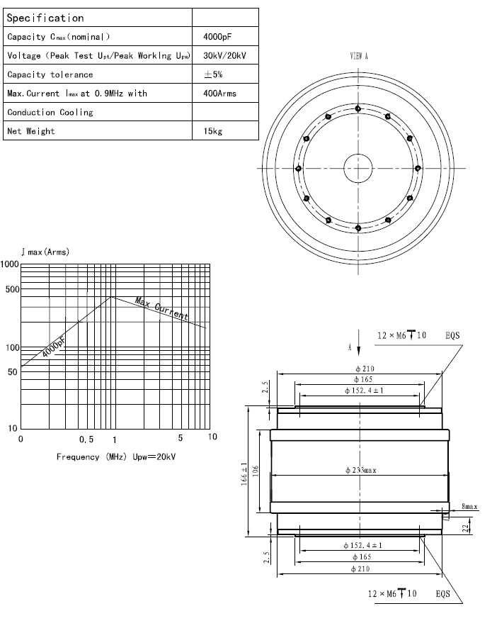 CKT4000/25/400固定陶瓷高压真空电容器采用陶瓷外壳、真空介质、具有耐压高、体积小、Q值高、性能稳定可靠价格低廉等特点,广泛用于感应加热、介质加热、通讯、广播等设备。