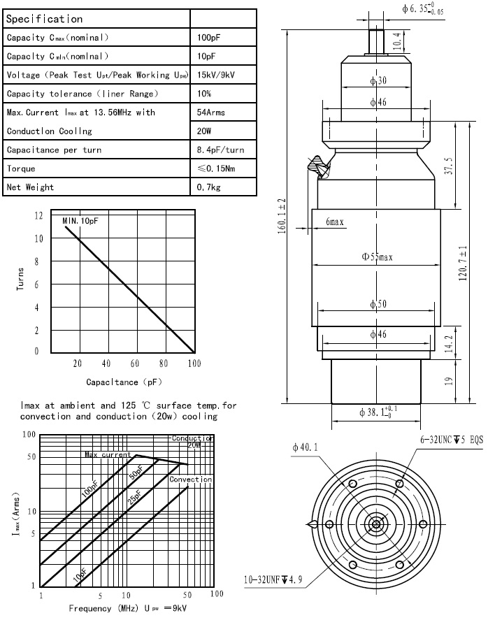 CKTB100/10/54(I)型可变陶瓷高压真空电容器采用陶瓷外壳、真空介质、具有耐压高、体积小、Q值高、性能稳定可靠、价格低廉等特点,广泛用于感应加热、介质加热、通讯、广播等设备。