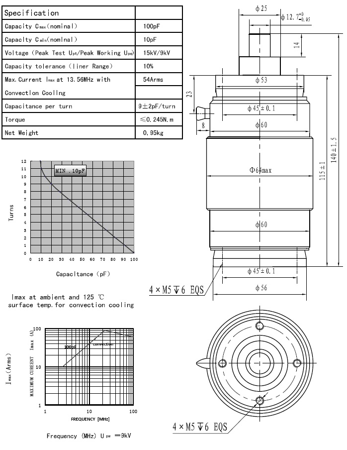 CKTB100/10/54(II)型可变陶瓷高压真空电容器采用陶瓷外壳、真空介质、具有耐压高、体积小、Q值高、性能稳定可靠、价格低廉等特点,广泛用于感应加热、介质加热、通讯、广播等设备。