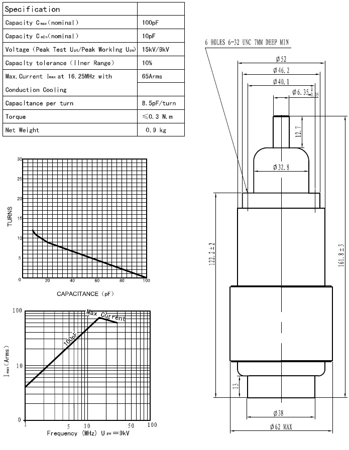CKTB100/10/65型可变陶瓷高压真空电容器采用陶瓷外壳、真空介质、具有耐压高、体积小、Q值高、性能稳定可靠、价格低廉等特点,广泛用于感应加热、介质加热、通讯、广播等设备。