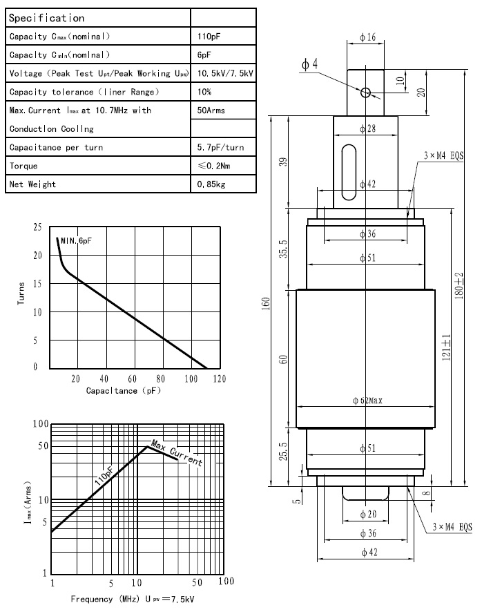CKTB110/7.5/50可变陶瓷高压真空电容器采用陶瓷外壳、真空介质、具有耐压高、体积小、Q值高、性能稳定可靠价格低廉等特点,广泛用于感应加热、介质加热、通讯、广播等设备
