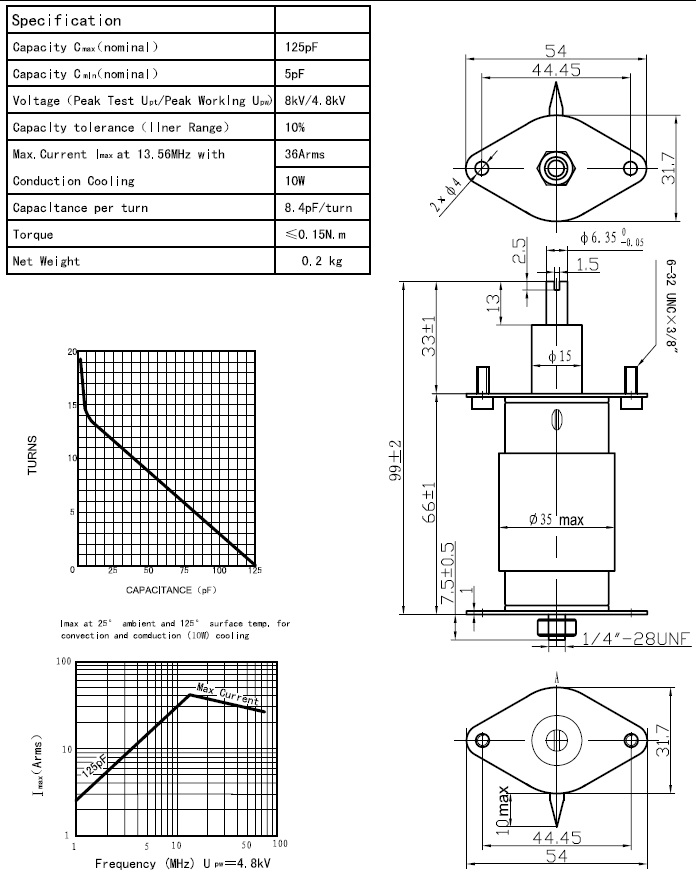 CKTB125/4.8/36可变陶瓷高压真空电容器采用陶瓷外壳、真空介质、具有耐压高、体积小、Q值高、性能稳定可靠、价格低廉等特点,广泛用于感应加热、介质加热、通讯、广播等设备。