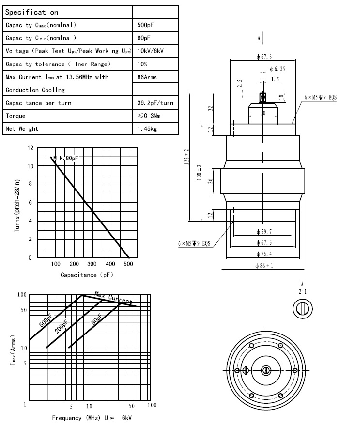 CKTB500/7/86可变陶瓷高压真空电容器采用陶瓷外壳、真空介质、具有耐压高、体积小、Q值高、性能稳定可靠、价格低廉等特点,广泛用于感应加热、介质加热、通讯、广播等设备。