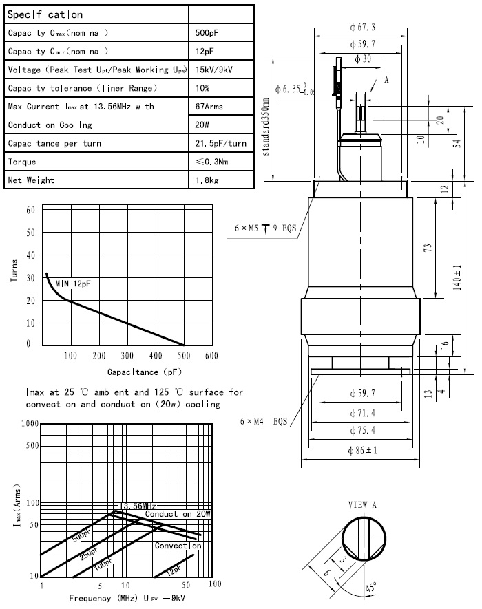 CKTB500/10/67可变陶瓷高压真空电容器采用陶瓷外壳、真空介质、具有耐压高、体积小、Q值高、性能稳定可靠、价格低廉等特点,广泛用于感应加热、介质加热、通讯、广播等设备。