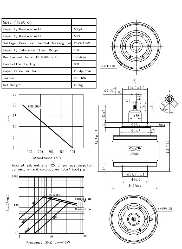 CKTB500/17.5/170可变陶瓷高压真空电容器采用陶瓷外壳、真空介质、具有耐压高、体积小、Q值高、性能稳定可靠、价格低廉等特点,广泛用于感应加热、介质加热、通讯、广播等设备。