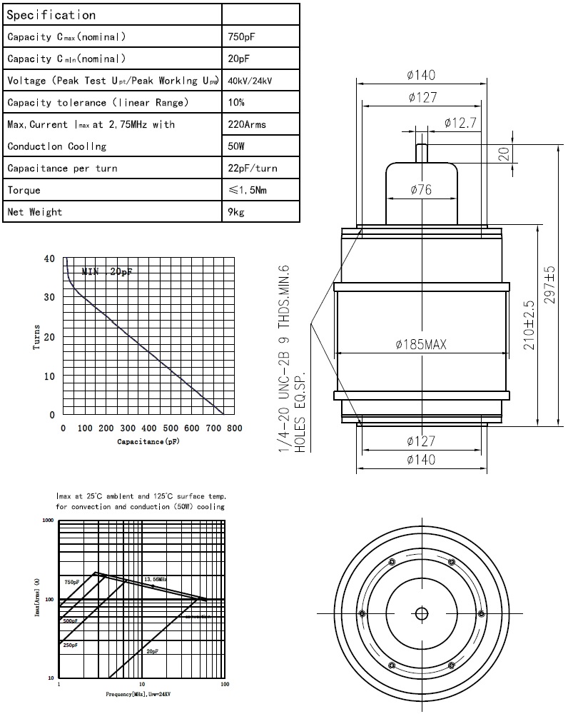 CKTB750/28/220可变陶瓷高压真空电容器采用陶瓷外壳、真空介质、具有耐压高、体积小、Q值高、性能稳定可靠、价格低廉等特点,广泛用于感应加热、介质加热、通讯、广播等设备。