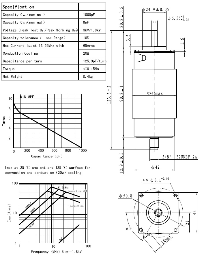 CKTB1000/2.1/65可变陶瓷高压真空电容器采用陶瓷外壳、真空介质、具有耐压高、体积小、Q值高、性能稳定可靠、价格低廉等特点,广泛用于感应加热、介质加热、通讯、广播等设备。