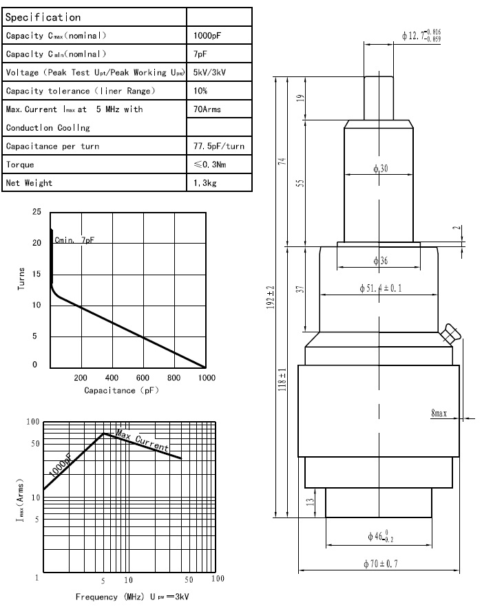 CKTB1000/3.5/70可变陶瓷高压真空电容器采用陶瓷外壳、真空介质、具有耐压高、体积小、Q值高、性能稳定可靠价格低廉等特点,广泛用于感应加热、介质加热、通讯、广播等设备。