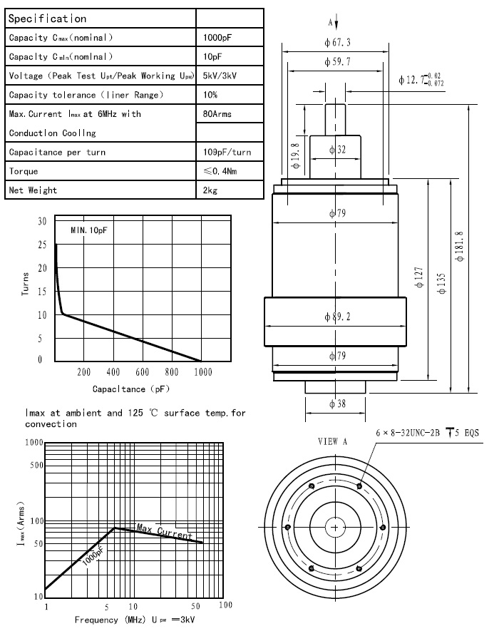 CKTB1000/3.5/80可变陶瓷高压真空电容器采用陶瓷外壳、真空介质、具有耐压高、体积小、Q值高、性能稳定可靠、价格低廉等特点,广泛用于感应加热、介质加热、通讯、广播等设备。