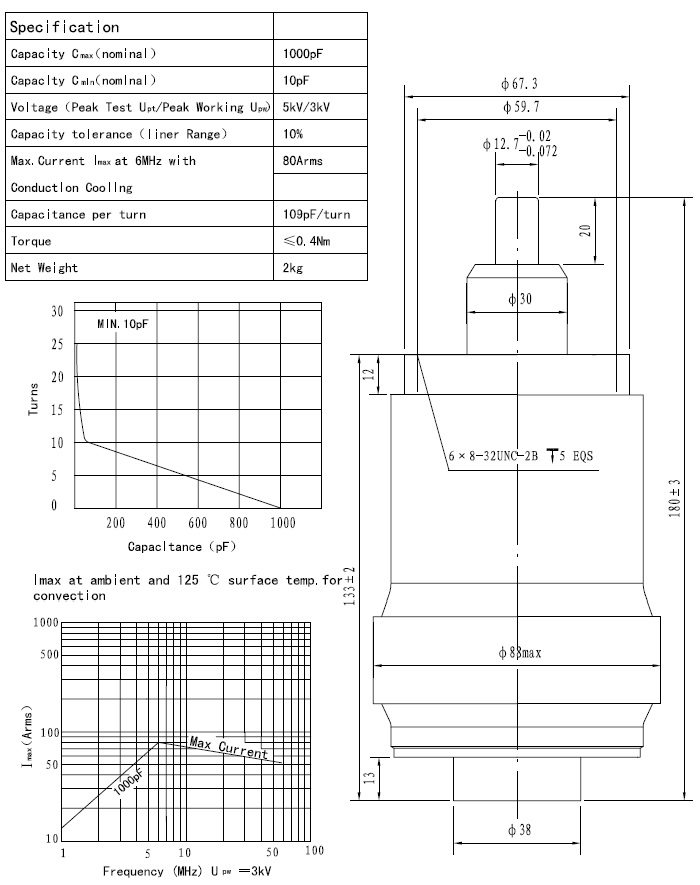 CKTB1000/3.5/80(I)可变陶瓷高压真空电容器采用陶瓷外壳、真空介质、具有耐压高、体积小、Q值高、性能稳定可靠价格低廉等特点,广泛用于感应加热、介质加热、通讯、广播等设备。