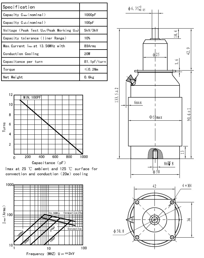 CKTB1000/3.5/89(I)可变陶瓷高压真空电容器采用陶瓷外壳、真空介质、具有耐压高、体积小、Q值高、性能稳定可靠、价格低廉等特点,广泛用于感应加热、介质加热、通讯、广播等设备。