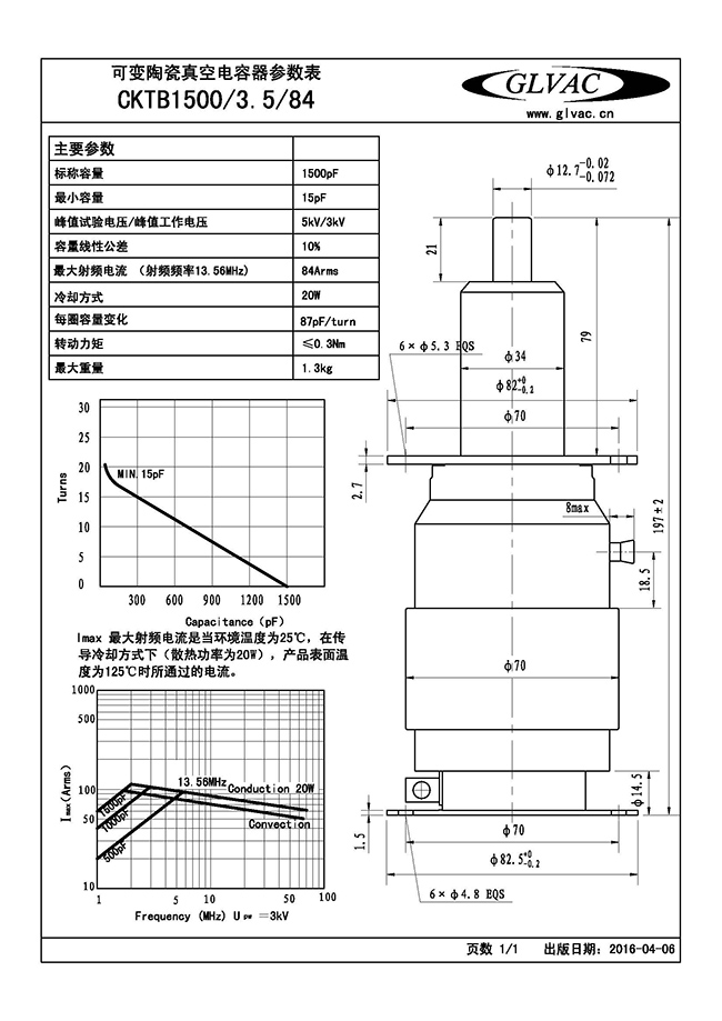CKTB1500/3.5/84可变陶瓷高压真空电容器采用陶瓷外壳、真空介质、具有耐压高、体积小、Q值高、性能稳定可靠、价格低廉等特点,广泛用于感应加热、介质加热、通讯、广播等设备。