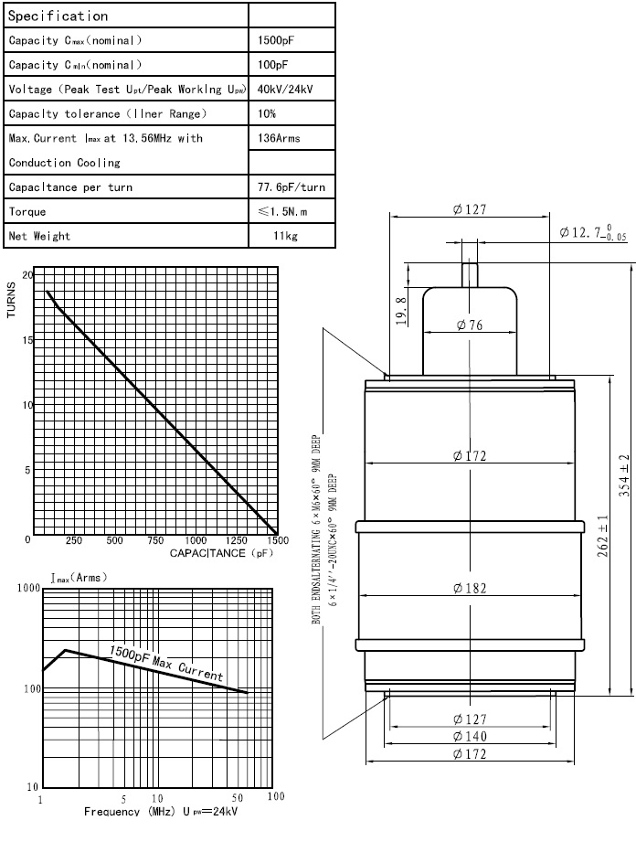CKTB1500/24/220(I)可变陶瓷高压真空电容器采用陶瓷外壳、真空介质、具有耐压高、体积小、Q值高、性能稳定可靠、价格低廉等特点,广泛用于感应加热、介质加热、通讯、广播等设备。