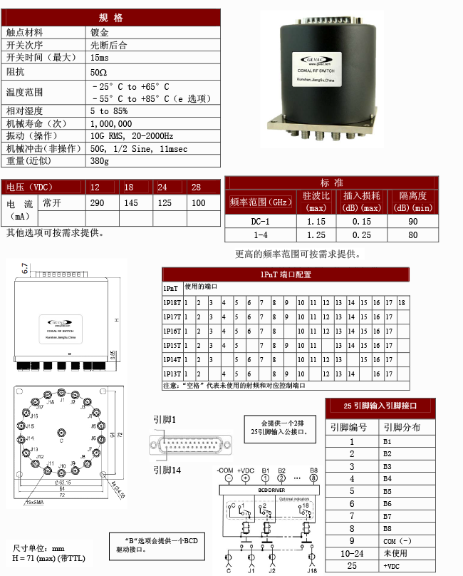 射频同轴继电器也称之为微波同轴继电器,它是由同轴高频接头作为射频引出端的射频继电器,由于同轴高频接头传输的微波信号具有频率高、频带宽、信息量大的特点,所以射频同轴继电器广泛应用于航海、通信、科技等领域的多路通信、中继通信、散射通信、移动通信、卫星通信、雷达系统、导航系统、电子对抗、测量检测等系统中。