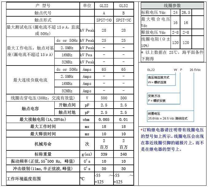 单刀单掷继电器GL22钨制触点用于开关电源真空介质,接触电阻低泄漏电流低,可以直接替换KILOVAC的KC-22真空继电器,替换JENNINGS 的RJ8A真空继电器。