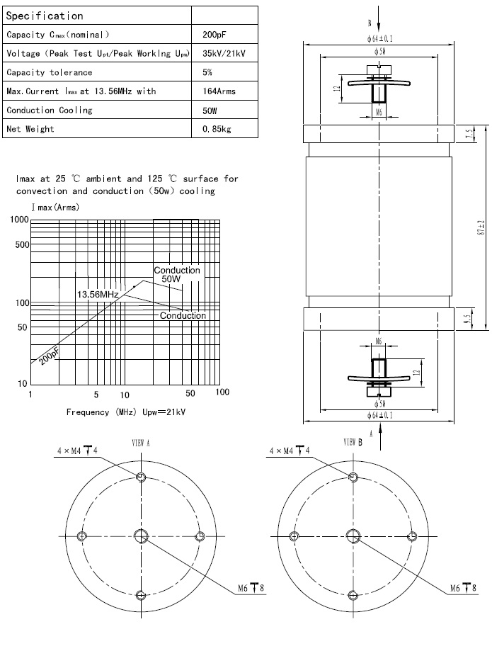 CKT200/25/164固定陶瓷高压真空电容器采用陶瓷外壳、真空介质、具有耐压高、体积小、Q值高、性能稳定可靠广泛用于感应加热、介质加热、通讯、广播等设备。