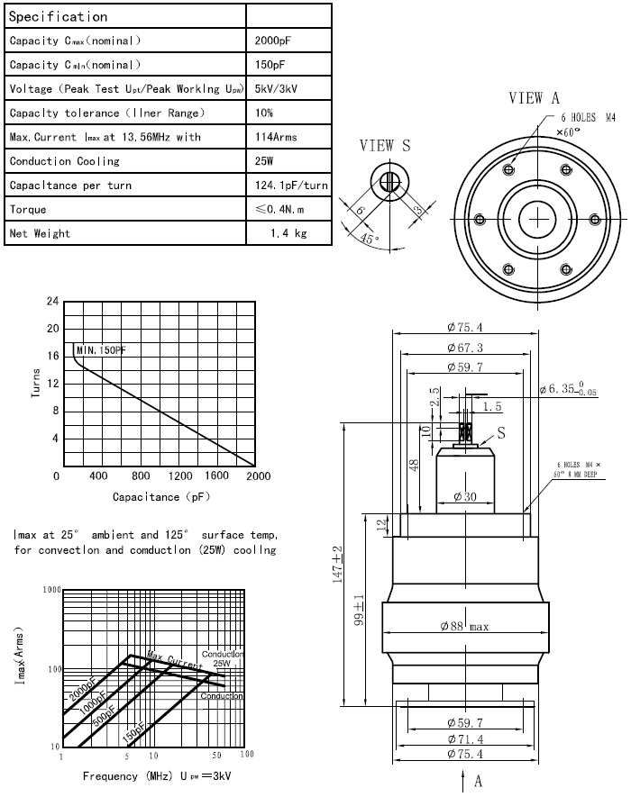 CKTB2000/3.5/114可变陶瓷高压真空电容器采用陶瓷外壳、真空介质、具有耐压高、体积小、Q值高、性能稳定可靠、价格低廉等特点,广泛用于感应加热、介质加热、通讯、广播等设备。