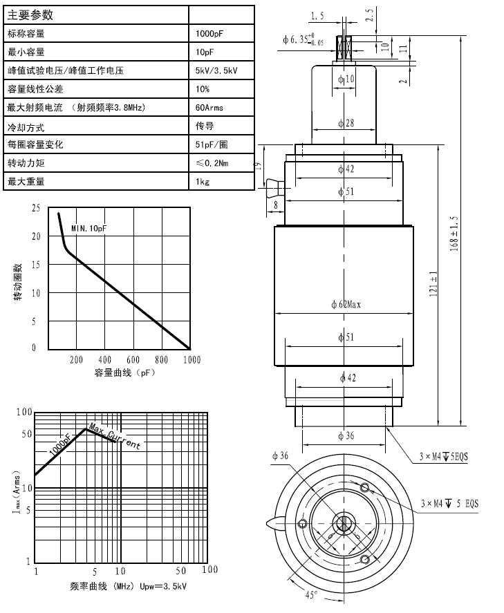 CKTB1000/3.5/60(Ⅲ)可变陶瓷高压真空电容器采用陶瓷外壳、真空介质、具有耐压高、体积小、Q值高、性能稳定可靠、价格低廉等特点,广泛用于感应加热、介质加热、通讯、广播等设备。