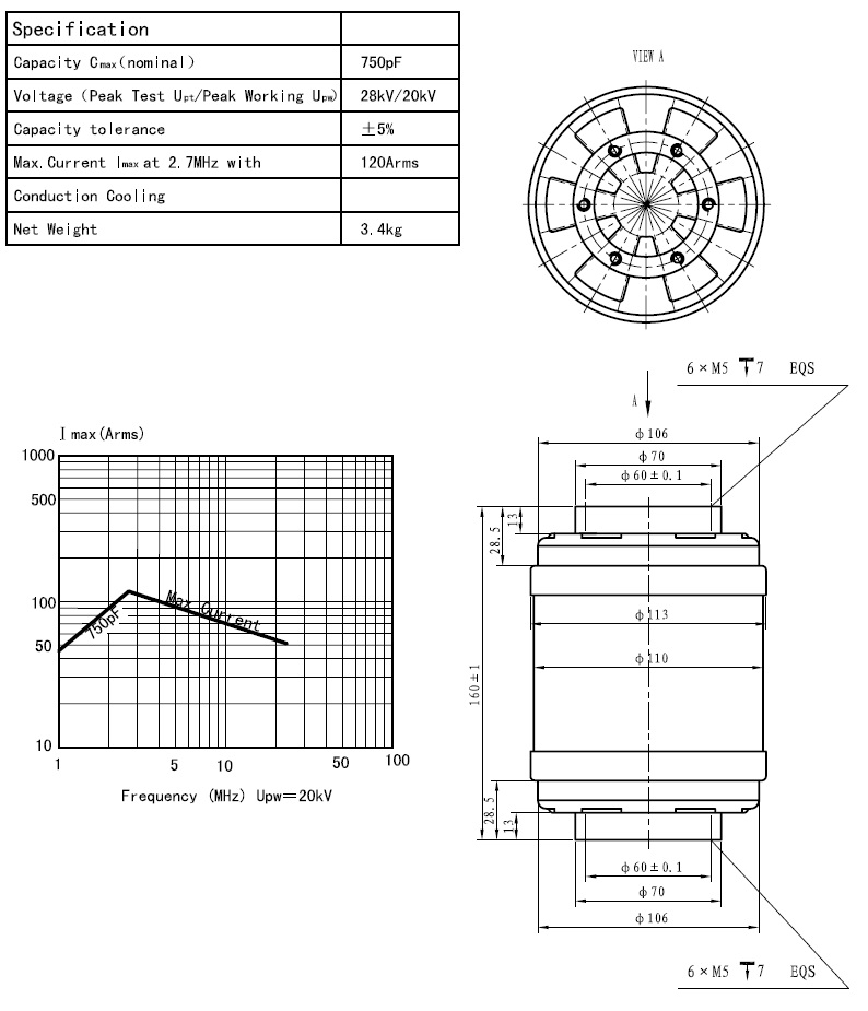 CKT750/20/120(I)型固定陶瓷高压真空电容器采用陶瓷外壳、真空介质、具有耐压高、体积小、Q值高、性能稳定可靠广泛用于感应加热、介质加热、通讯、广播等设备。