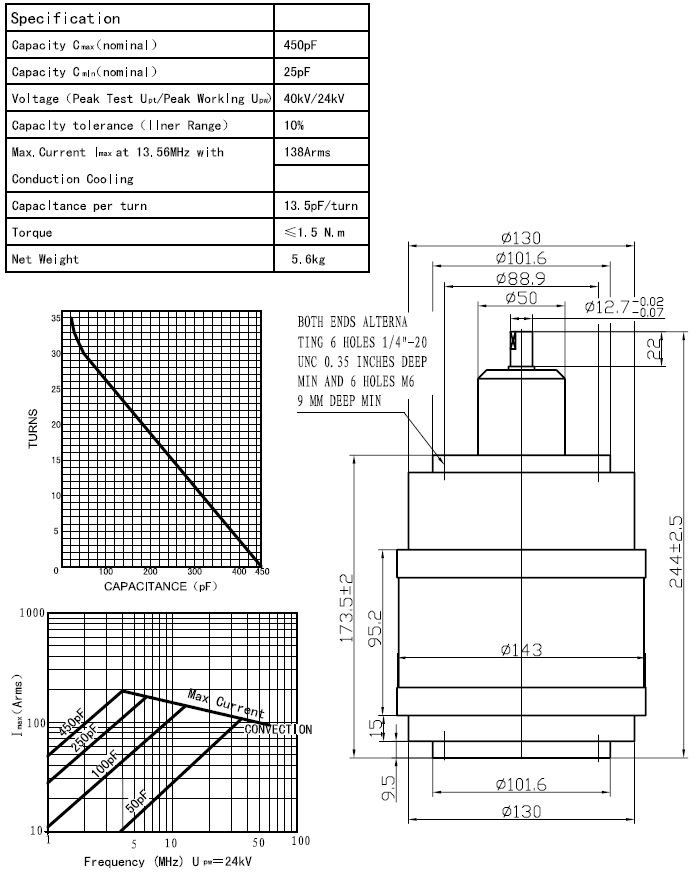 CKTB450/28/138可变陶瓷高压真空电容器采用陶瓷外壳、真空介质、具有耐压高、体积小、Q值高、性能稳定可靠、价格低廉等特点,广泛用于感应加热、介质加热、通讯、广播等设备。