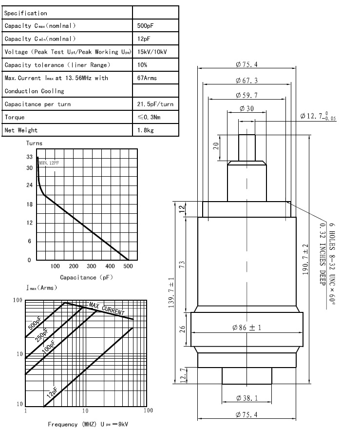 CKTB500/10/67(I)可变陶瓷高压真空电容器采用陶瓷外壳、真空介质、具有耐压高、体积小、Q值高、性能稳定可靠、价格低廉等特点,广泛用于感应加热、介质加热、通讯、广播等设备。