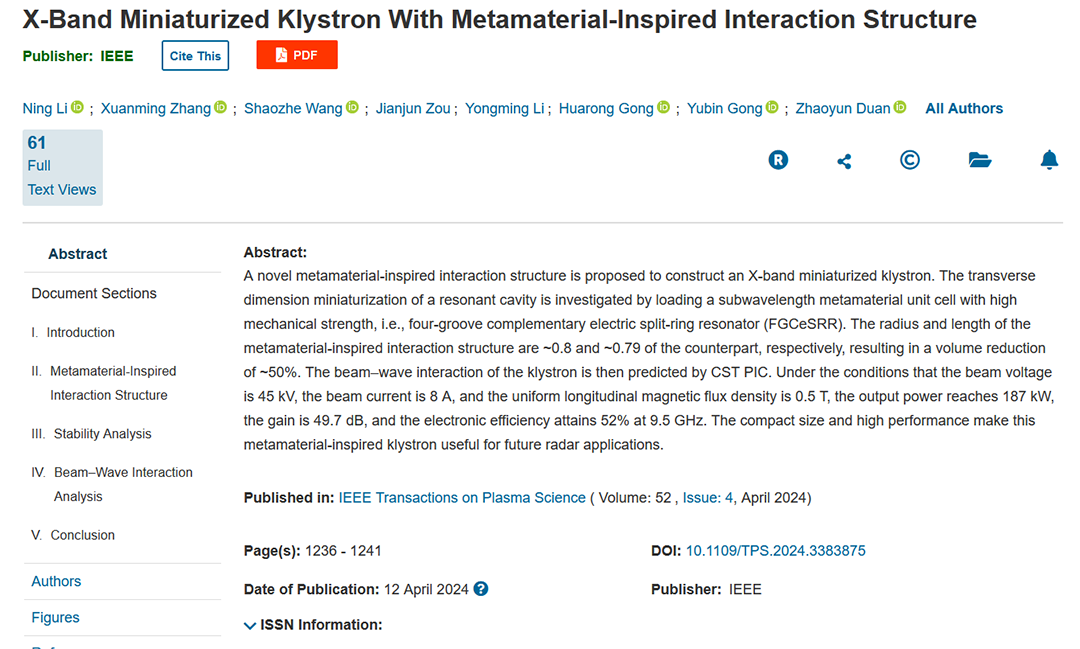 尊龙凯时大功率器件工业技术研究院(以下简称国力研究院)李永明、王少哲、邹建军团队与电子科技大学科学与工程学院段兆云教授团队共同在《IEEE Transactions on Electron Devices》刊登发表题为“X-Band Miniaturized KIystron With MetamateriaI-Inspired lnteraction Structure”的文章。
