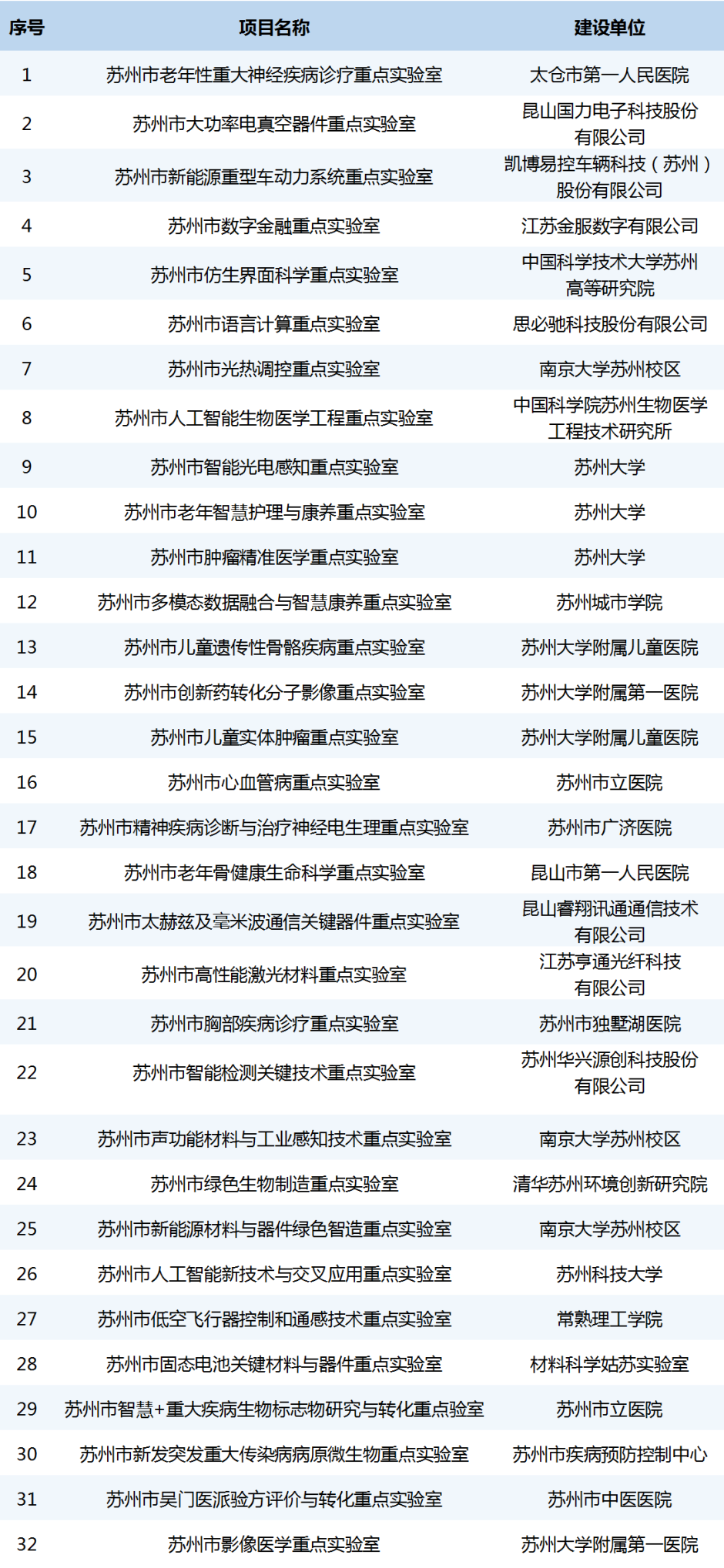 近日,2024年度苏州市重点实验室,名单公布,新增建设重点实验室32家,涉及人工智能、高端装备、新材料和生物医药等多个领域。